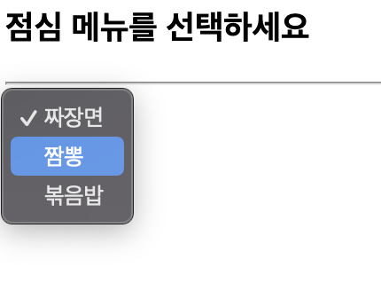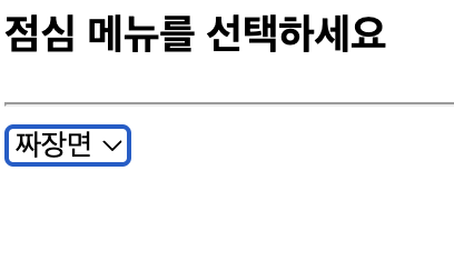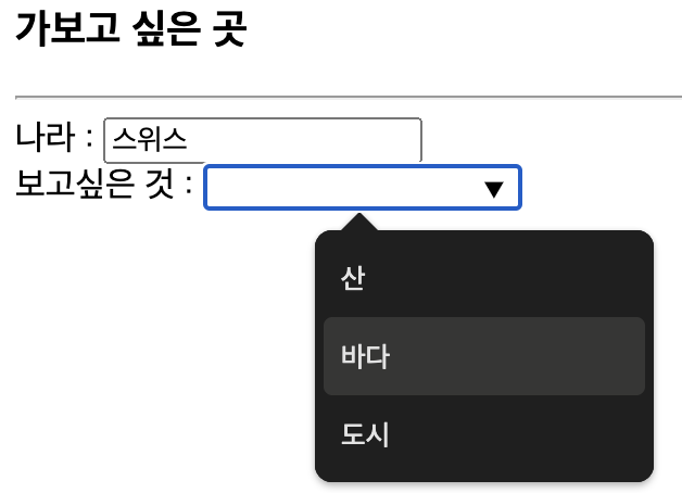 선택된 입력: 콤보박스 <select> 태그 드롭다운 리스트에 목록 출력, 목록을 선택하는 입력 방식