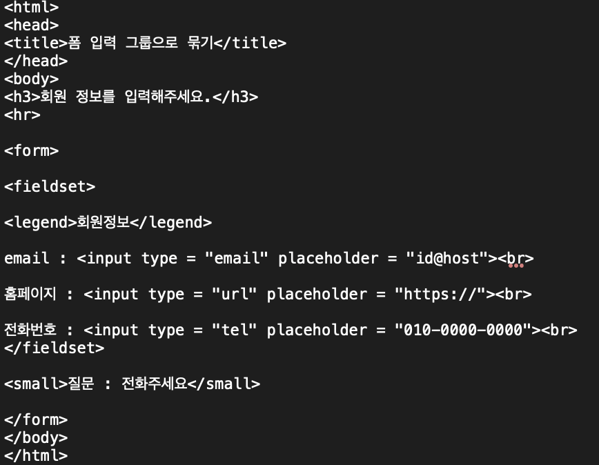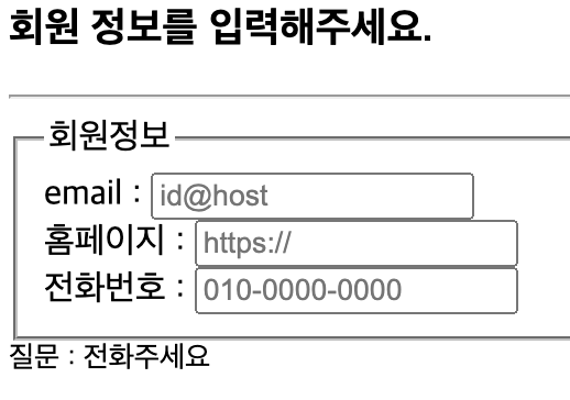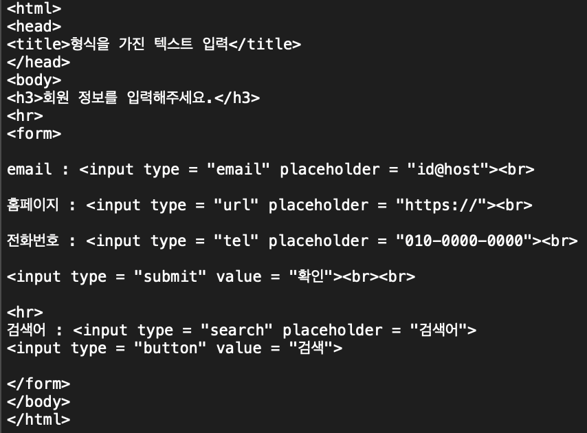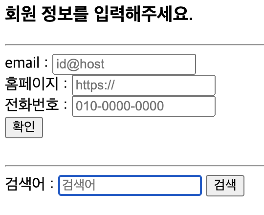 - <input type = "email | url | tel | seart"> : 이메일, url, 전화번호, 검색 등 형식을 검사