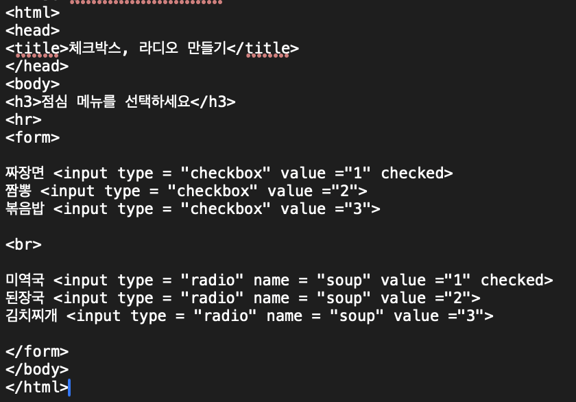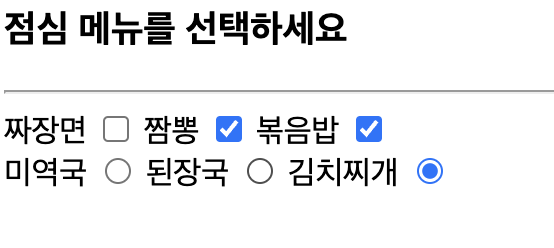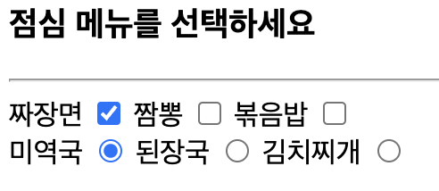 <input type = "checkbox | radio" name = "요소이름" value = "요소값(폼 요소가 선택된 상태일 때, 웹서버에 전송되는 값)" checked(초기값으로 선택 된 내용으로 출력)>