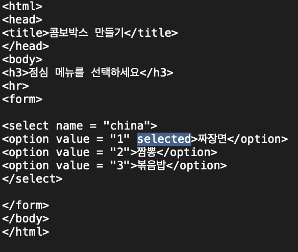 <option value = "옵션값(항목이 선택되었을 때 웹 서버에 전송되는 값)" selected(초기 선택된 상태로 보여지는값)>