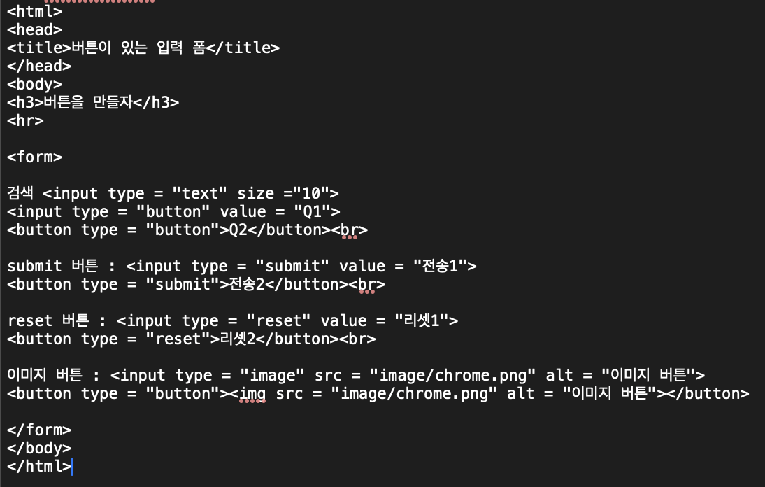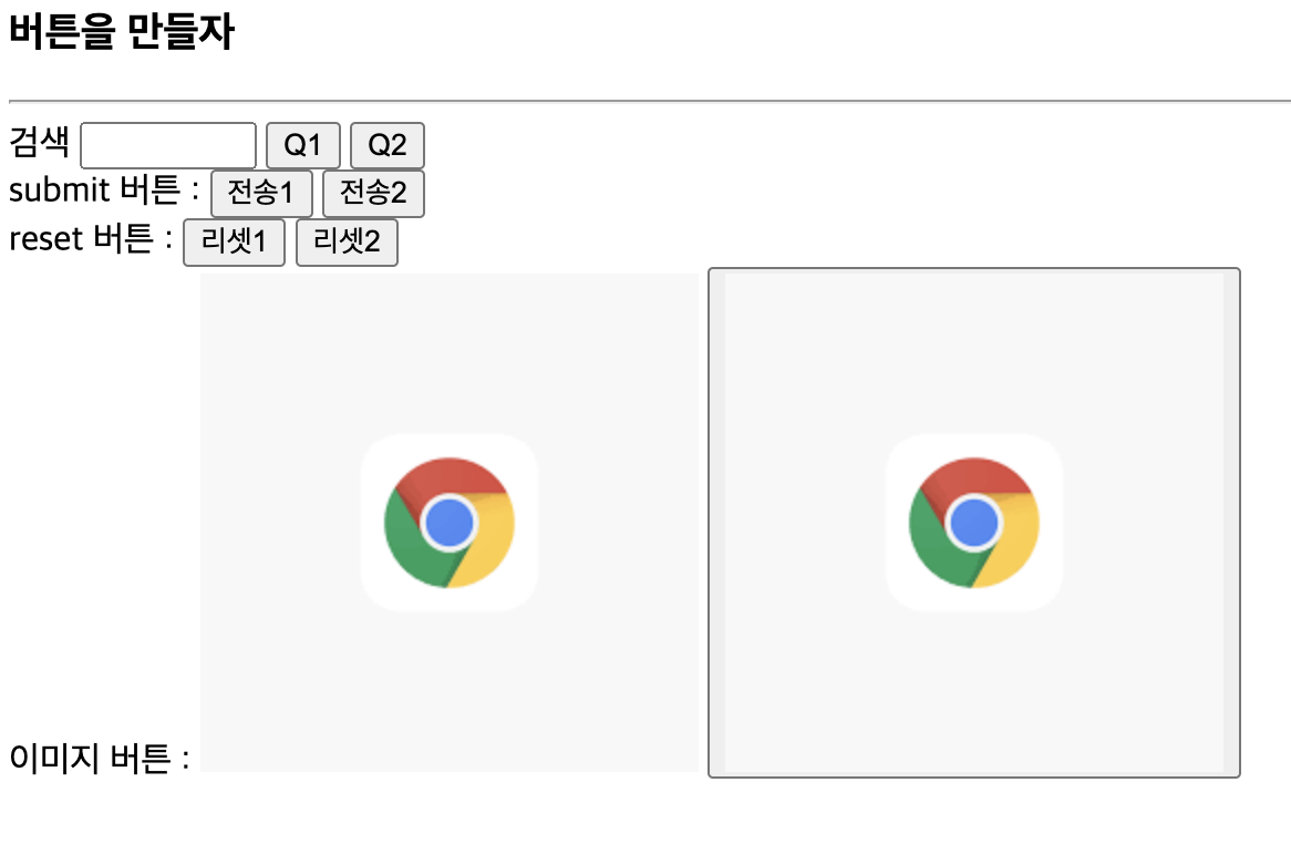 방식 1. <input type = "button | reset | submit | image" value = "버튼에 들어갈 문자열">