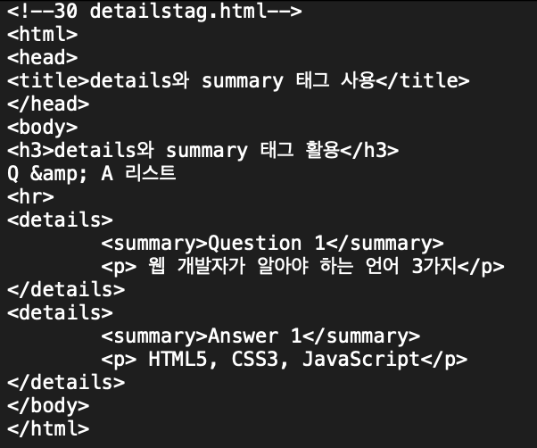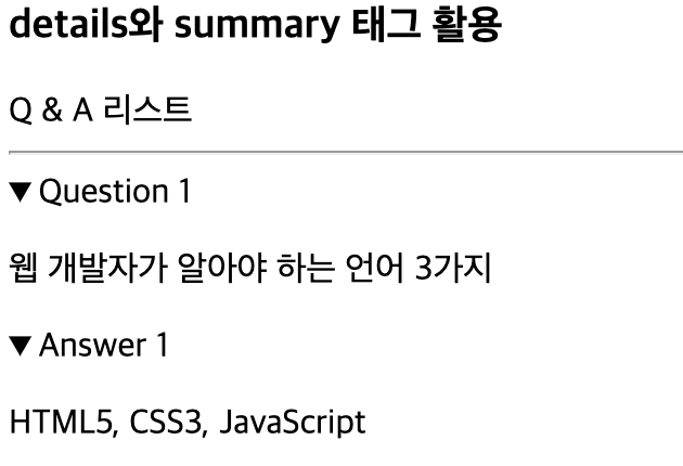 ex) <details> 태그를 이용하여 Q&A 리스트를 만들고, 사용자가 핸들(▶)(토글)을 클릭하여 항목을 보거나 숨길수 있다.