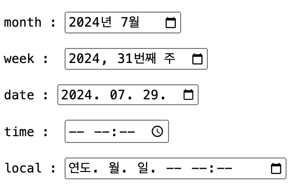 - <input type = "month | week | date | time | datetime-local"> : 년, 월, 일, 시간 등의 정보 입력창