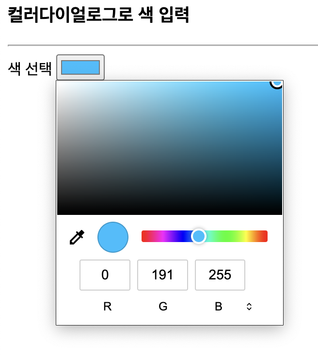 <input type = "color" value = "#00FF00(초기값 지정 가능)"> : 컬러 다이얼로그 출력, 사용자로부터 색 선택